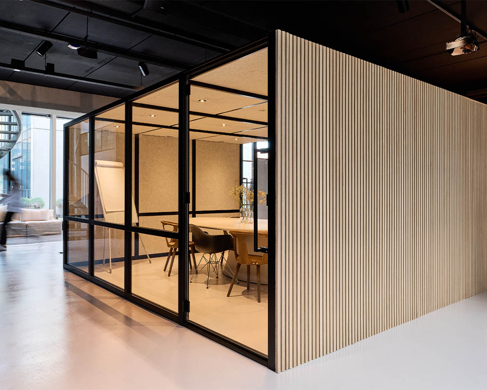 Onze adviseur Marvin dacht mee en kwam uit bij de BOW Twelve belcel: een ruime, akoestische vergaderruimte met een stijlvolle afwerking in houten wandpanelen.