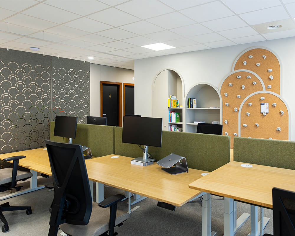 Bij de keuze voor het meubilair stond werkcomfort centraal. De bureaus, stoelen en vergadertafels passen niet alleen bij de moderne uitstraling van het nieuwe interieur, maar zijn ook ontworpen om ergonomisch werken te stimuleren. Zo beschikken de werkplekken over verstelbare bureaus en comfortabele stoelen die langdurig gebruik ondersteunen.